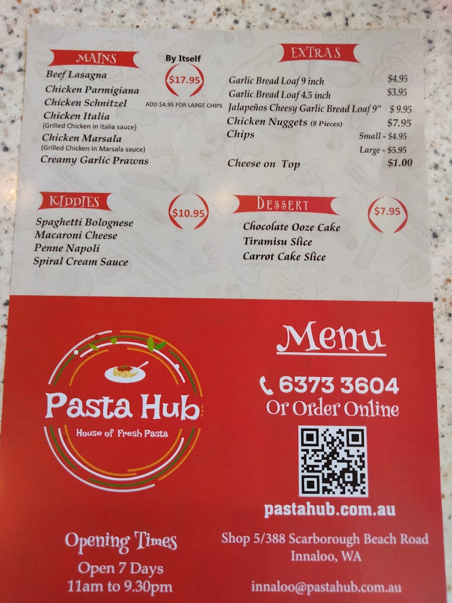 Welcome to Pasta Hub Innaloo, a hidden gem nestled in the Westfield Village Shopping Centre, where pasta lovers unite. From the moment you enter, you're greeted by a bright and inviting ambiance, perfect for a casual meal or a quick takeaway. The menu showcases a delightful variety of freshly made pasta dishes, including standout creations like spinach fettuccini with romano sauce and chili spirals with shrimp supreme sauce. Each plate is crafted with high-quality ingredients, ensuring a burst of flavor in every bite.